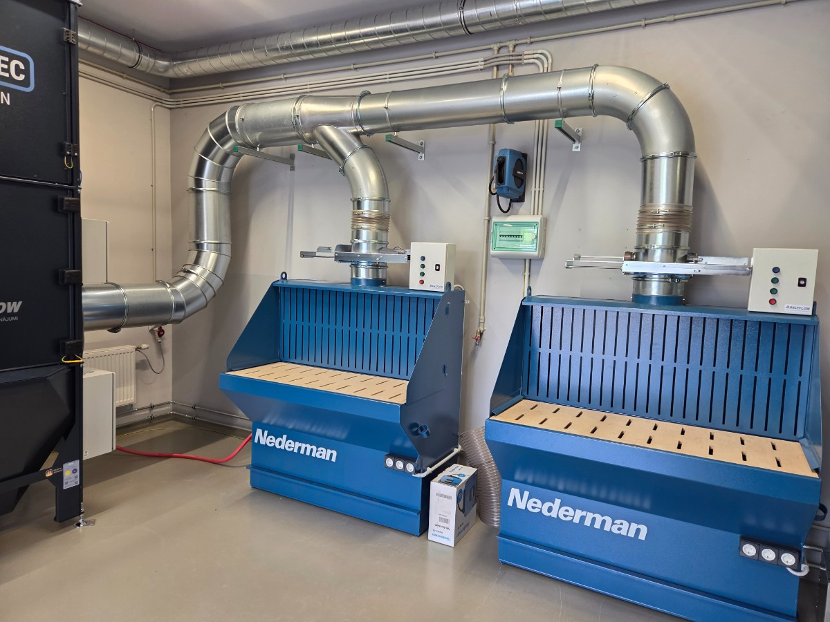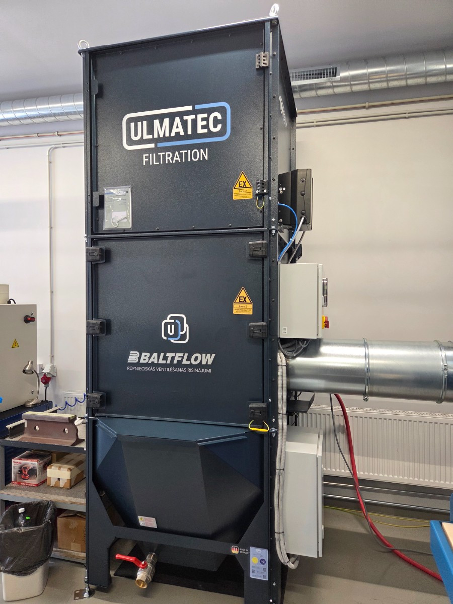 Projekta apjoms: 2 Nederman slīpēšanas galdi ar finiera virsmu un ULMATEC mitrais separators ar iebūvētu ventilatoru, automātisko ūdens līmeņa kontroles sistēmu, frekvenču pārveidotāju un vadības bloku. Jauda 5,5 kW, ražība 5 500 m3/st, galda virsmas nosūces ātrums 0,45 – 1,00 m/s. Izpildījums atbilstoši ATEX prasībām.