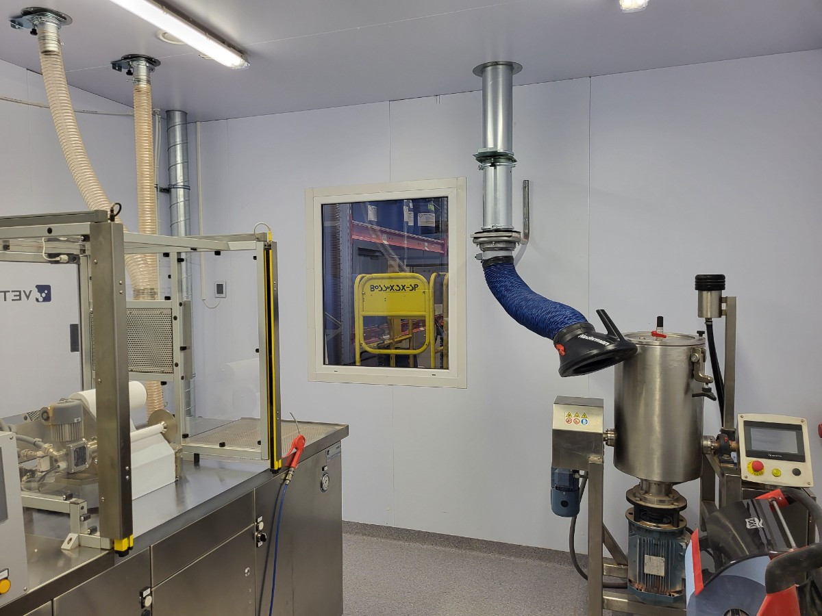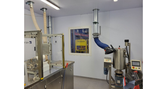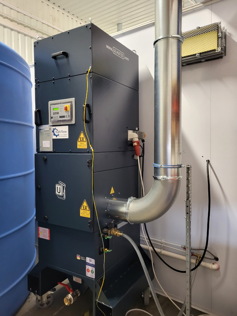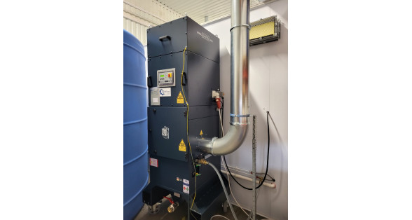 Scope: ULMATEC wet separator with built-in fan, automatic water level control system, automatic drainage system and control unit. Power 3 kW, capacity 1,500 m3/h. The system complies with the ATEX requirements. 3 Nederman telescopic extraction arms.
