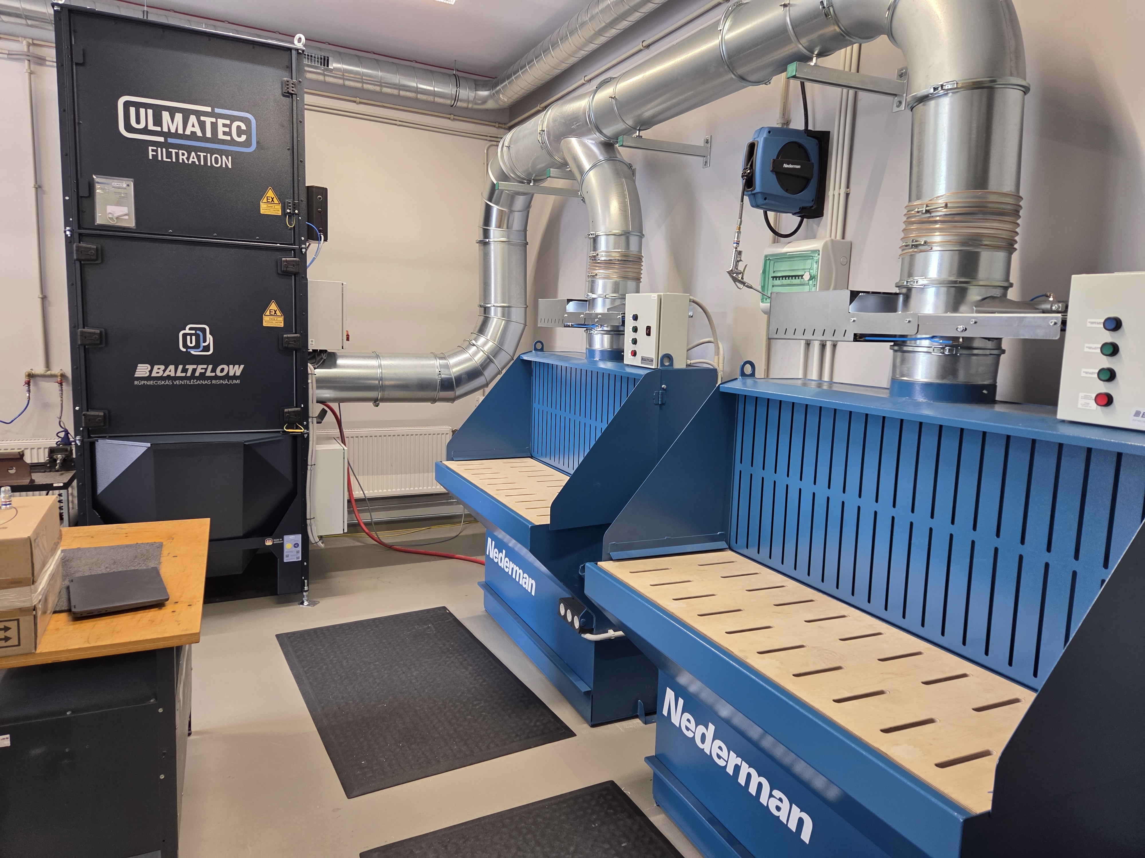 Projekta apjoms: 2 Nederman slīpēšanas galdi ar finiera virsmu un ULMATEC mitrais separators ar iebūvētu ventilatoru, automātisko ūdens līmeņa kontroles sistēmu, frekvenču pārveidotāju un vadības bloku. Jauda 5,5 kW, ražība 5 500 m3/st, galda virsmas nosūces ātrums 0,45 – 1,00 m/s. Izpildījums atbilstoši ATEX prasībām.