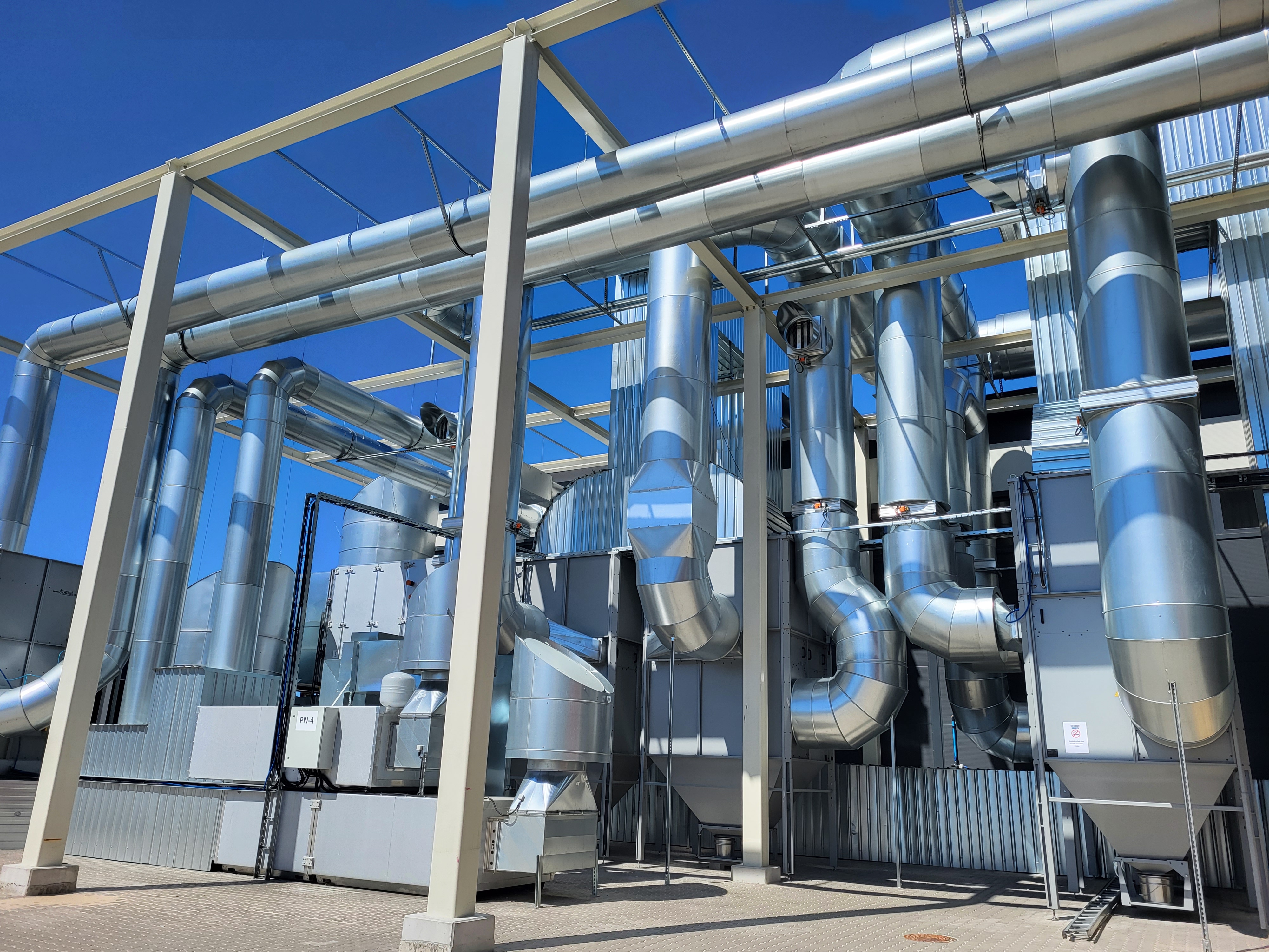 Projekta apjoms: Sistēma ar summāro jaudu 150 kW (4 * 37,5 kW), gaisa plūsma 112 000 m3/st (4 * 28 000 m3/st). Papildus 22 kW iekārta ar 9 nosūces rokām.